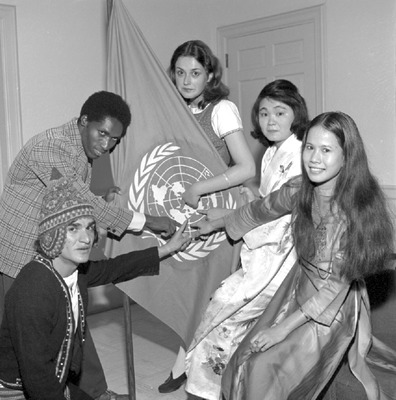 The Jacksonville State University International House celebrated United Nations Day with a tea and open house on October 24, 1976. Shown with the United Nations Day flag are Alberto Ruiz (Peru), Harrison Kago (Kenya), Elisabeth Sturm (Austria), Masako Kinoshita (Japan), and Thao Nguyen (Vietnam).