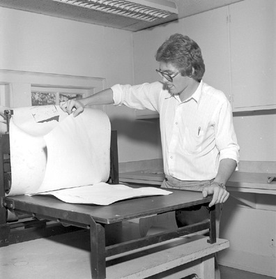 This unidentified male was an art student at Jacksonville State University in 1976-1977. Shown he works with a roller and paper.