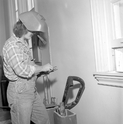 Bill McClure was an art student at Jacksonville State University in 1976-1977. Shown he works with metal.