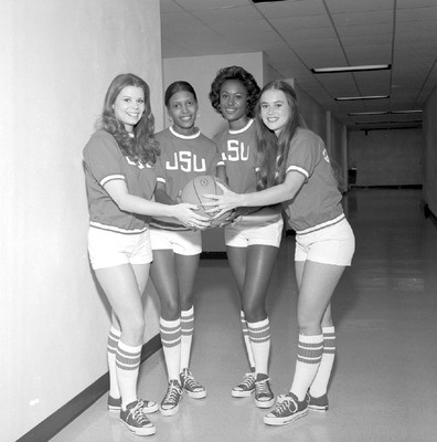 These students were basketball girls at Jacksonville State University in 1976-1977. Shown from left are Karen Clark, Rhonda Passmore, Joyce Morgan, Iris Boone.