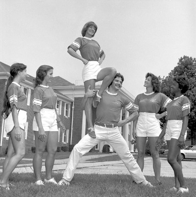 A cheerleading clinic was held on the campus of Jacksonville State University July 11-15, 1977. High school cheerleaders took part in the annual Alabama High School Athletic Association's cheerleading clinic. Shown are staff. (circa July 11, 1977)