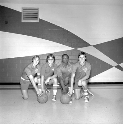 These students were men's basketball team managers at Jacksonville State University in 1976-1977. Shown from left are Lowell Eudy, Donald Myers, Harold Underwood, Randy Coleman.