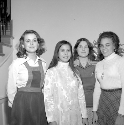 International House program students stand inside the International House at Jacksonville State University in 1976-1977. Identified are Elisabeth Sturm (Austria), Thao Nguyen (Vietnam), Deborah Campbell (Nicaragua). (circa 1977)
