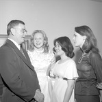 Students gathered inside the Jacksonville State University International House for a dinner forum. Anniston clothing expert Claude Kitchen, guest speaker, summarized American fashion. Shown are Claude Kitchen, Debbie Barnett, Masako Kinoshita, and Elisabeth Sturm. (circa 1977)
