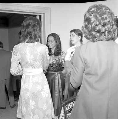 Guests are greeted in a receiving line inside the International House at Jacksonville State University in 1976-1977. Identified program student is Jasmin Eslait (Colombia).