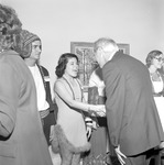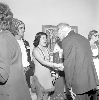 Guests are greeted in a receiving line inside the International House at Jacksonville State University in 1976-1977. Identified program students are Alberto Ruiz (Peru), Sonia de Moraes (Brazil), Sinikka Makela (Finland).