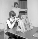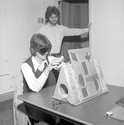 A guest in the physics department works a puzzle at Jacksonville State University in 1976-1977. This may have been a part of Physics Day.