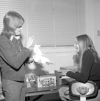 Two students work with a pigeon, possibly in the physics department, at Jacksonville State University in 1976-1977.