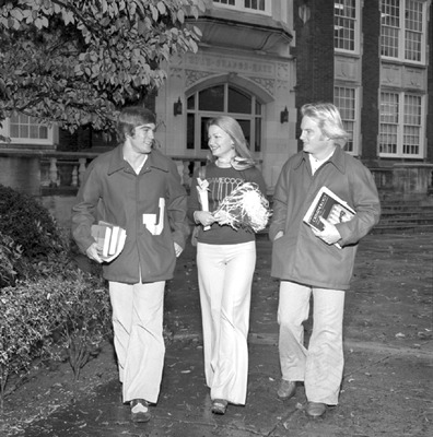 The homecoming game held October 30, 1976 at Jacksonville State University was a special occasion for the Hammett family. Johnny Hammett, right, started as center in his first home game ever. Cathy Hammett, center, was a finalist in the homecoming queen contest. Ray Hammett, headed specialty teams and was linebacker. Bernard Hammett was the 1952 football captain and returned for alumni events. (circa October 28, 1976)