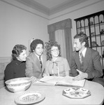 International House program students gather at a table inside the International House at Jacksonville State University in 1975-1976. Identified are Luis Generali (Brazil), Kristina Eriksson (Sweden), Javier Prado (Bolivia). (circa 1975)
