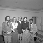 International House program students stand inside the International House at Jacksonville State University in 1975-1976. Shown from left are John Edwards (Australia), Margret Oddsdottir (Iceland), Javier Prado (Bolivia), Jennifer Norgate (England), Harrison Kago (Kenya). (circa December 6, 1975)