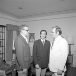 A check was presented to the International House by Clarence Darrow, plant manager of Federal Mogul-World Wide Distribution Center of Jacksonville, to fund a scholarship for the 1975-1976 year at Jacksonville State University. Shown are John Stewart (International House Director), Javier Prado (Bolivia), and Clarence Darrow. (circa 1975)