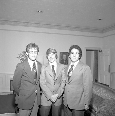 International House program students stand inside the International House at Jacksonville State University in 1975-1976. Identified are Bruce Donzelmann (Holland) and Luis Generali (Brazil). (circa 1975)