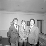International House program students stand inside the International House at Jacksonville State University in 1975-1976. Identified are Bruce Donzelmann (Holland) and Luis Generali (Brazil). (circa 1975)