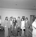 International House program students stand inside the International House with guests at Jacksonville State University in 1975-1976. Identified students are Solomon Cardenas, Bruce Donzelmann, Maria Vergara, Wai-Man Siu. (circa 1976)