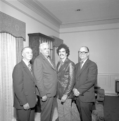 International House program student John Edwards stands inside the International House with guests at Jacksonville State University in 1975-1976. Identified is President Ernest Stone. (circa 1976)