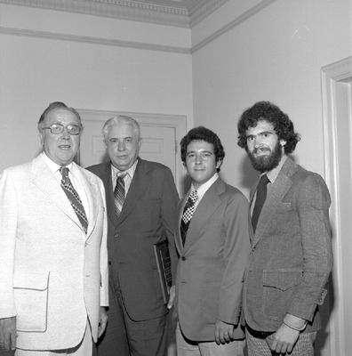 Luis Generali and John Edwards were International House Program students at Jacksonville State University in 1975-1976. They stand inside the International House with President Ernest Stone and a guest during a special event. (circa 1976)