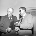 Jacksonville State University President Ernest Stone is presented a plaque from International House Director John Stewart. (circa 1976)