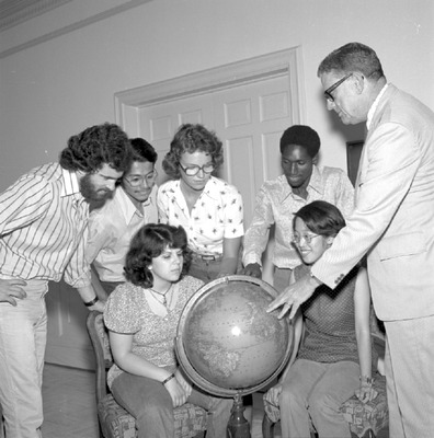 International House program students gather around a globe with house director John Stewart at Jacksonville State University in 1975-1976. Students are Solomon Cardenas, Kristina Erikson, Harrison Kago, John Stewart, Maria Vergara, Olivia Shao. (circa 1976)