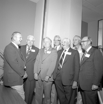 The bankers association held a meeting at Jacksonville State University in 1977-1978. President Ernest Stone stands among the group.