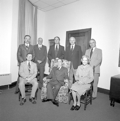 These faculty were members of the Council of Deans at Jacksonville State University in 1977-1978. Shown from left are, seated, Dr. James Reaves, Dean of Graduate School, Dr. Theron Montgomery, Vice President of Academic Affairs, Dr. Alta Millican, Dean of the School of Library Science, standing, Dr. Thomas Barker, Dean of the School of Law Enforcement, Dr. Greene Taylor, Dean of the School of Education, Dr. H. Bascom Woodward, III, Dean of University Admissions, Dr. Richard H. Shuford, Dean of the School of Business Administration, Dr. Reuben Boozer, Dean of the College of Arts and Sciences. Not shown was Dean Mary Margaret Williams, Dean of Lurleen B. Wallace School of Nursing.