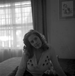 An unidentified female individual sits on a bed inside a bedroom in 1977.