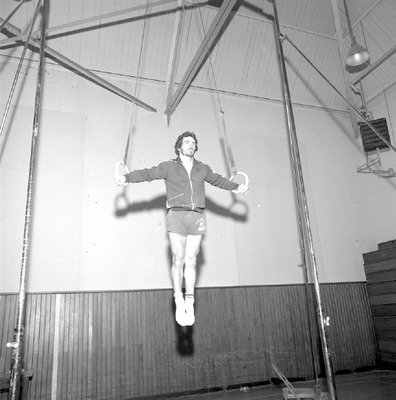 Kevin Nee was a member of the men's gymnastics team at Jacksonville State University in 1977-1978. Shown he uses the rings.