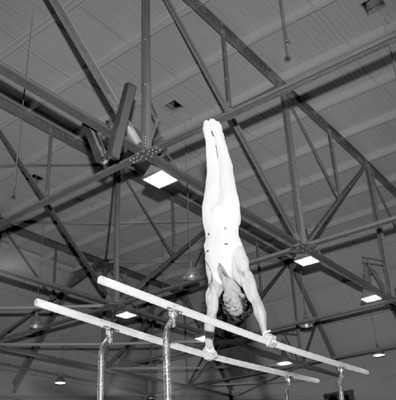 Kevin Nee was a member of the men's gymnastics team at Jacksonville State University in 1977-1978. Shown he uses the parallel bars.