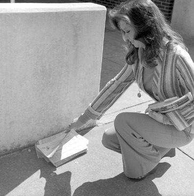 A female individual kneels to pick up a copy of The Chanticleer, student newspaper, outside at Jacksonville State University in 1976-1977. (circa February 14, 1977)