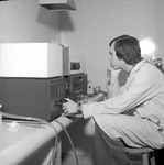 Tim Landers concentrates on the atomic absorption-flame emission machine in the chemistry department at Jacksonville State University in 1976-1977. (circa January 24, 1977)