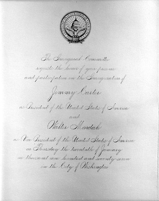 An invitation reads, "The Inaugural Committee requests the honor of your presence and participation in the Inauguration of Jimmy Carter as President of the United States of America and Walter Mondale as Vice President of the United States of America on Thursday the twentieth of January one thousand nine hundred and seventy-seven in the City of Washington." The invitation appeared in The Chanticleer. (circa January 17, 1977)