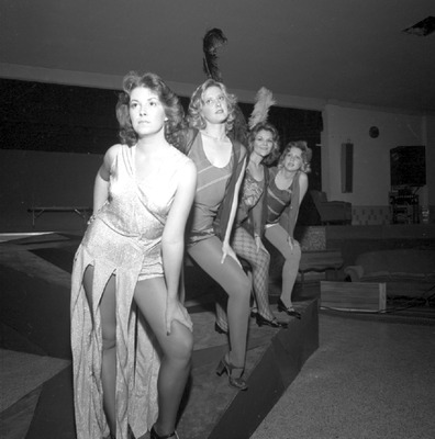 The musical "Cabaret" tells the story of the rise of the Nazis in the early 1930s. The play was performed October 25-28, 1977 in the Leone Cole Auditorium. It was directed by Wayne Claeren, choreography by Harriet Payne, and set and light design by Carlton Ward. Shown are rehearsal scenes. (circa October 28, 1977)
