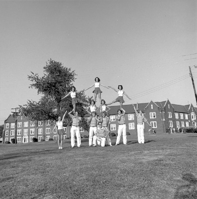 Jacksonville State University 1977-1978 cheerleaders practice in the grass outside on campus. Cheerleaders were Peggy Fingar, Debi Hoskins, Kerry Tackett, Kathy York, Cheryl Wright, Barbara Downey, Bobby Ezekiel, Cal Faircloth, Shane Cochran, Dale Johnson, Barbara Downey.