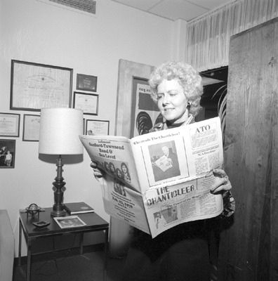 Mrs. Julia Snead, Director of Developmental Enterprises and Alumni, holds an issue of The Chanticleer inside an office at Jacksonville State University. (circa February 13, 1978)