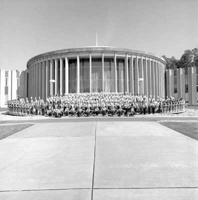 These students were members of the Marching Southerners band at Jacksonville State University in 1977-1978. Shown in uniform the full group is gathered outside Merrill Hall. The band was under the direction of Dr. David Walters, Mike Holbrook (drum major), and Joyce Neighbors (assistant drum major).