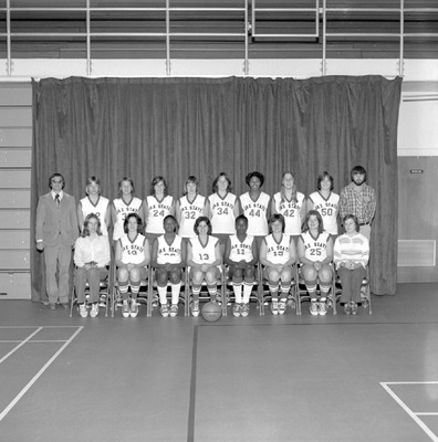 These students were members of the 1977-1978 women's basketball team at Jacksonville State University. Basketball team members were Lou Ann Jones, Susan Young, Ann Tillman, Cathy Satterfield, Theresa Davis, Jill Collins, Cheryl Van Pelt, Kathleen Kemp, Pat Price, Mary Ellen Gill (manager), Anthony Townson (assistant coach), Renita Stowers, Kathy Burge, Sharon Armour, Felicia Kendricks, Vicki Holmes, Ronnie Akers (coach), Paula Jennings (manager).