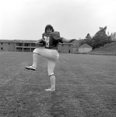 Billy Vining was a member of the football team at Jacksonville State University in 1977-1978. Shown in uniform with a football he poses on the football field.