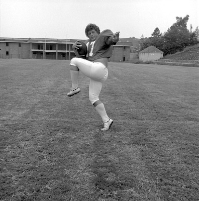 Rolo Weaver was a member of the football team at Jacksonville State University in 1977-1978. Shown in uniform with a football he poses on the football field.
