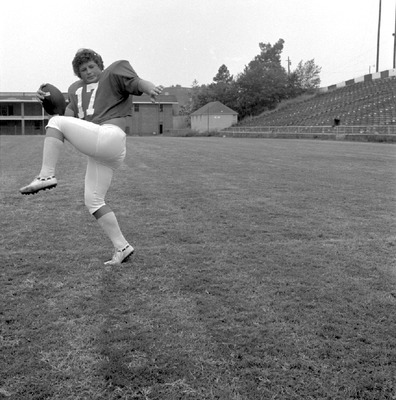 Rolo Weaver was a member of the football team at Jacksonville State University in 1977-1978. Shown in uniform with a football he poses on the football field.