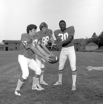 These students were members of the football team at Jacksonville State University in 1977-1978. Shown are Butch Barker (tight end), Ricky Grammer (split end), and James Coleman (wingback).