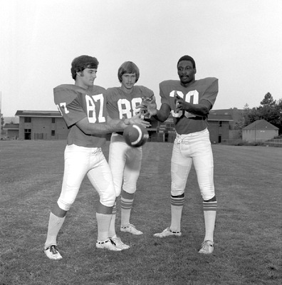 These students were members of the football team at Jacksonville State University in 1977-1978. Shown are Butch Barker (tight end), Ricky Grammer (split end), and James Coleman (wingback).