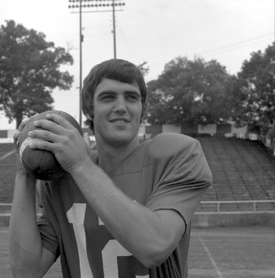 Bobby Ray Green was a member of the football team at Jacksonville State University in 1977-1978. Shown in uniform the quarterback poses on the football field.