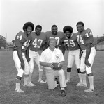 Jacksonville State University head football coach Jim Fuller poses alongside 1977 football players Mitchell Knox, Jess Wright, James Coleman, Gurley Swanigan, and Mike Baxter.