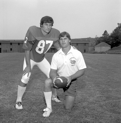 Jacksonville State University graduate assistant football coach Grady Maddox poses alongside 1977 football player Butch Barker.