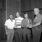 Jacksonville State University head football Coach Jim Fuller holds a trophy standing next to sportswriter Jimmy Bryan. President Ernest Stone and Jim Skidmore hold a trophy together also.