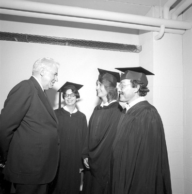 Graduation exercises were held at Jacksonville State University in 1977-1978. Shown President Ernest Stone stands with a group of three graduating students. (circa 1977)