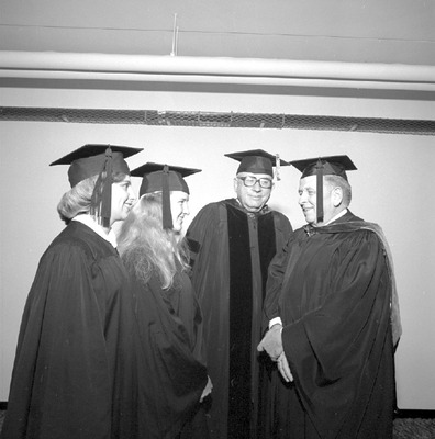 Graduation exercises were held at Jacksonville State University in 1977-1978. Shown President Ernest Stone stands with a group of graduating students and possible special guest. (circa 1977)