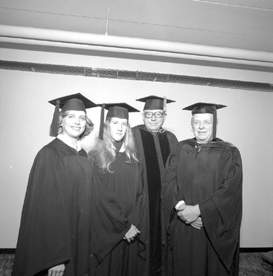 Graduation exercises were held at Jacksonville State University in 1977-1978. Shown President Ernest Stone stands with a group of graduating students and possible special guest. (circa 1977)