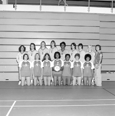 The 1976-1977 women's volleyball team members are shown inside the gymnasium at Jacksonville State University. Shown from left are, kneeling, Polly Sewell, Anita Burnett, Debra Dobbs, Lenora Peters, Dorothy Grimmett, Cindy Pettitt, Patricia Agee, standing, Ana Recurt, Yvonne Gunn, Jan Roberts, Pam Murdock, Lucy Bonds, Janice Whitaker, Beverly Caviness, Karen Hester, and Sharon Laney (team manager and trainer).