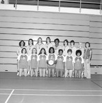 The 1976-1977 women's volleyball team members are shown inside the gymnasium at Jacksonville State University. Shown from left are, kneeling, Polly Sewell, Anita Burnett, Debra Dobbs, Lenora Peters, Dorothy Grimmett, Cindy Pettitt, Patricia Agee, standing, Ana Recurt, Yvonne Gunn, Jan Roberts, Pam Murdock, Lucy Bonds, Janice Whitaker, Beverly Caviness, Karen Hester, and Sharon Laney (team manager and trainer).